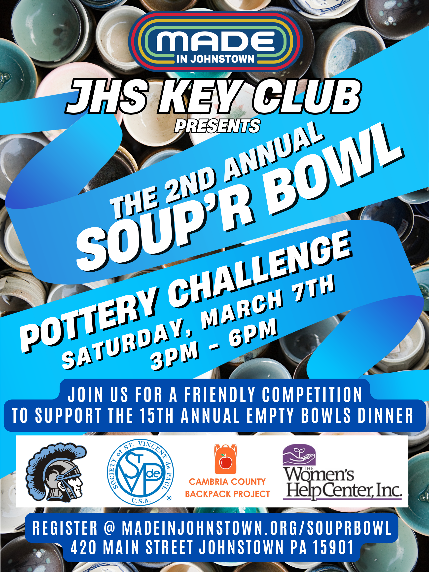 Calling all Pottery makers from beginners to advanced ceramicists! Made in Johnstown is hosting an “empty bowls” pottery throwing event to support three local organizations combatting hunger and homelessness in the Greater Johnstown community! This bowl throwing event is setup competition style, with the grand prize & statue awarded to the contestant who makes the most bowls during their timeslot! There will also be a few “superlative” prize categories & winners that will be outlined on the day of the event.
